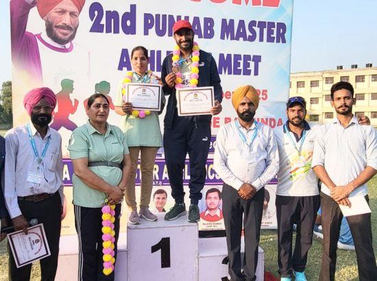 ਗੋਨਿਆਣਾ ਮੰਡੀ, 14 ਅਕਤੂਬਰ 2025:ਮਿਲਖਾ ਸਿੰਘ ਮਾਸਟਰਜ ਅਥਲੈਟਿਕਸ ਦੇ ਬੈਨਰ ਹੇਠ ਬਠਿੰਡਾ ਦੇ ਡੀ ਏ ਵੀ ਕਾਲਜ ਸਟੇਡੀਅਮ ਵਿਖੇ ਸੰਪੰਨ ਹੋਈਆਂ ਦੋ ਦਿਨਾਂ ਸਟੇਟ ਖੇਡਾਂ ਵਿੱਚ ਗੋਨਿਆਣਾ ਮੰਡੀ ਦੇ ਅਧਿਆਪਕ ਪਤੀ ਪਤਨੀ ਨੇ ਸ਼ਾਨਦਾਰ ਪੁਜੀਸ਼ਨਾਂ ਹਾਸਿਲ ਕਰਕੇ ਗੋਨਿਆਣੇ ਦਾ ਨਾਮ ਰੌਸ਼ਨ ਕੀਤਾ ਹੈ। ਬਠਿੰਡਾ ਜ਼ਿਲ੍ਹੇ ਦੀ ਸ਼ਾਨ ਨੈਸ਼ਨਲ ਅਵਾਰਡੀ ਅਧਿਆਪਕ ਰਾਜਿੰਦਰ ਸਿੰਘ ਗੋਨਿਆਣਾ ਮੰਡੀ ਨੇ ਪੰਜ ਕਿਲੋਮੀਟਰ ਦੌੜ ਵਿੱਚ ਭਾਗ ਲੈਂਦਿਆਂ ਆਪਣੇ ਉਮਰ ਵਰਗ ਵਿੱਚ ਤੀਸਰਾ ਸਥਾਨ ਹਾਸਿਲ ਕੀਤਾ ਹੈ ।