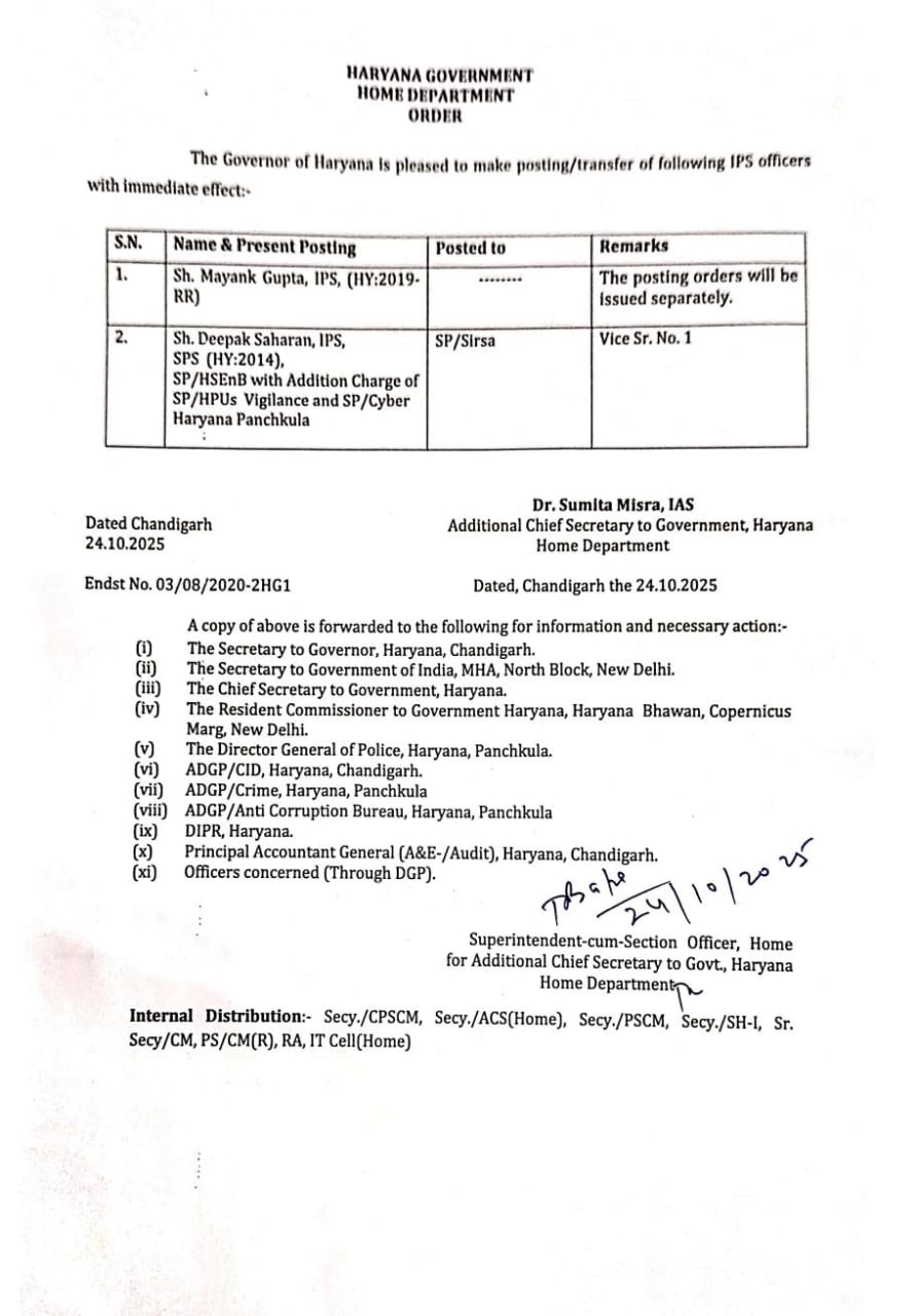 ਚੰਡੀਗੜ੍ਹ, 25 ਅਕਤੂਬਰ 2025 : ਹਰਿਆਣਾ ਸਰਕਾਰ ਨੇ ਪੁਲਿਸ ਪ੍ਰਸ਼ਾਸਨ ਵਿੱਚ ਫੇਰਬਦਲ ਕਰਦਿਆਂ ਦੋ ਆਈ.ਪੀ.ਐਸ. (IPS) ਅਧਿਕਾਰੀਆਂ ਦੇ ਤਬਾਦਲੇ ਦੇ ਹੁਕਮ ਜਾਰੀ ਕੀਤੇ ਹਨ: