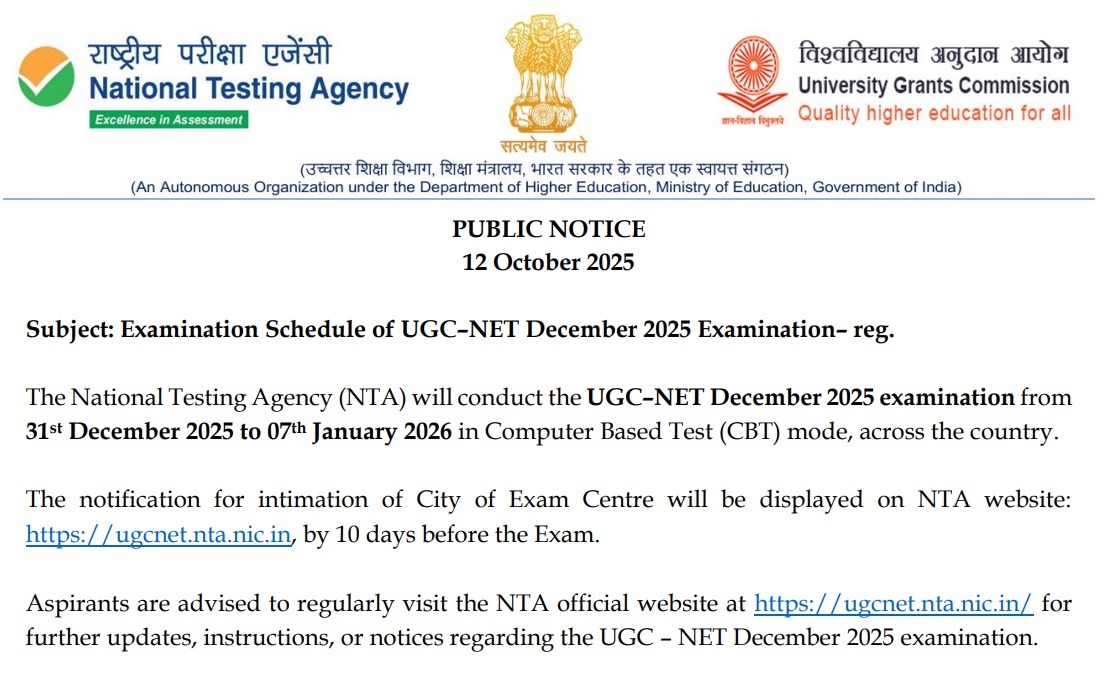 ਨਵੀਂ ਦਿੱਲੀ, 5 ਨਵੰਬਰ, 2025 : ਯੂਜੀਸੀ ਨੈੱਟ (UGC NET) ਦਸੰਬਰ 2025 ਪ੍ਰੀਖਿਆ ਲਈ ਅਪਲਾਈ ਕਰਨ ਵਾਲਿਆਂ ਲਈ ਇੱਕ ਜ਼ਰੂਰੀ ਖ਼ਬਰ ਹੈ। ਨੈਸ਼ਨਲ ਟੈਸਟਿੰਗ ਏਜੰਸੀ (NTA) ਨੇ ਅੱਜ (ਬੁੱਧਵਾਰ) ਨੂੰ ਇੱਕ ਐਡਵਾਈਜ਼ਰੀ (advisory) ਜਾਰੀ ਕਰਕੇ ਉਮੀਦਵਾਰਾਂ ਨੂੰ ਜਲਦ ਤੋਂ ਜਲਦ ਆਪਣੀ ਅਰਜ਼ੀ ਪ੍ਰਕਿਰਿਆ (application process) ਪੂਰੀ ਕਰਨ ਨੂੰ ਕਿਹਾ ਹੈ।