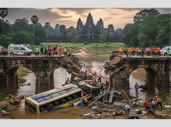 ਨੋਮ ਪੇਨ, 21 ਨਵੰਬਰ, 2025 : ਕੰਬੋਡੀਆ (Cambodia) ਦੇ ਮੱਧ ਸੂਬੇ ਕਾਂਪੋਂਗ ਥੌਮ (Kampong Thom) ਵਿੱਚ ਅੱਜ ਸਵੇਰੇ ਇੱਕ ਦਿਲ ਦਹਿਲਾ ਦੇਣ ਵਾਲਾ ਸੜਕ ਹਾਦਸਾ ਵਾਪਰ ਗਿਆ। ਦੱਸ ਦੇਈਏ ਕਿ ਇੱਥੇ ਸਵਾਰੀਆਂ ਨਾਲ ਭਰੀ ਇੱਕ ਬੱਸ ਪੁਲ ਤੋਂ ਸਿੱਧਾ ਨਦੀ ਵਿੱਚ ਜਾ ਡਿੱਗੀ, ਜਿਸ ਵਿੱਚ ਘੱਟੋ-ਘੱਟ 16 ਲੋਕਾਂ ਦੀ ਮੌਤ ਹੋ ਗਈ ਅਤੇ ਕਈ ਲੋਕ ਜ਼ਖਮੀ ਹੋ ਗਏ। ਪੁਲਿਸ ਦੀ ਮੁੱਢਲੀ ਜਾਂਚ ਵਿੱਚ ਸਾਹਮਣੇ ਆਇਆ ਹੈ ਕਿ ਡਰਾਈਵਰ ਨੂੰ ਨੀਂਦ ਦੀ ਝਪਕੀ ਆਉਣ ਕਾਰਨ ਇਹ ਭਿਆਨਕ ਹਾਦਸਾ ਵਾਪਰਿਆ ਹੈ।