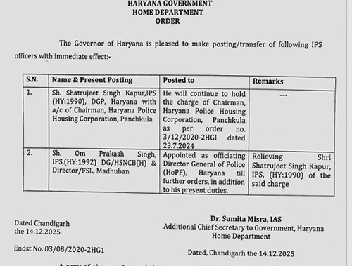 ਨੈੱਟਵਰਕ ਚੰਡੀਗੜ੍ਹ, 14 ਦਸੰਬਰ, 2025: ਹਰਿਆਣਾ ਸਰਕਾਰ ਨੇ ਸੋਮਵਾਰ ਨੂੰ ਡਾਇਰੈਕਟਰ ਜਨਰਲ ਆਫ਼ ਪੁਲਿਸ (DGP) ਦੇ ਅਹੁਦੇ ਤੋਂ ਸ਼ਤਰੂਜੀਤ ਐਸ. ਕਪੂਰ ਨੂੰ ਹਟਾ ਦਿੱਤਾ ਅਤੇ ਓ.ਪੀ. ਸਿੰਘ ਨੂੰ ਰਾਜ ਦਾ ਕਾਰਜਕਾਰੀ ਡੀਜੀਪੀ ਨਿਯੁਕਤ ਕੀਤਾ।