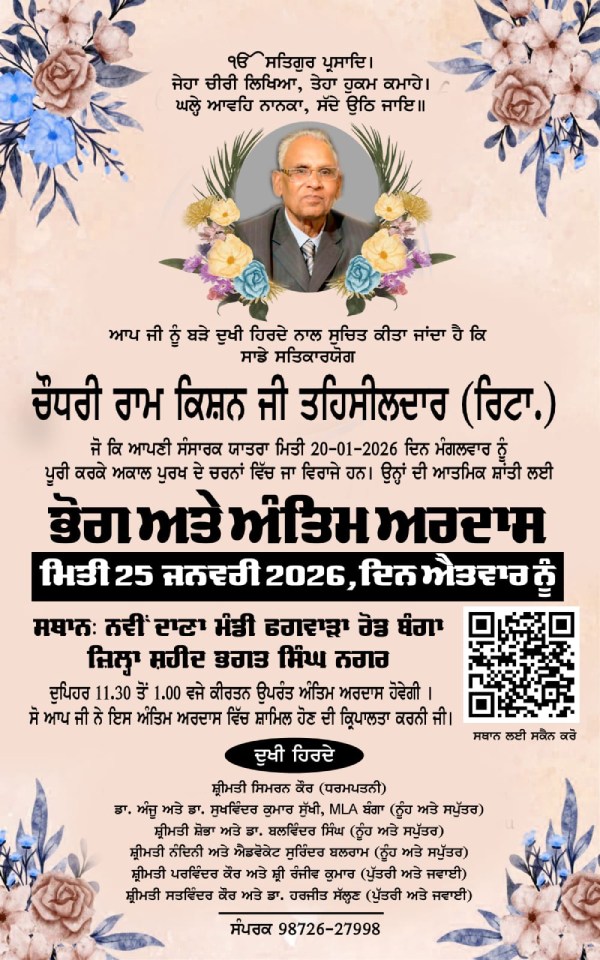 ਬੰਗਾ/ਸ਼ਹੀਦ ਭਗਤ ਸਿੰਘ ਨਗਰ, 24 ਜਨਵਰੀ 2026: ਬੰਗਾ ਵਿਧਾਨ ਸਭਾ ਹਲਕੇ ਤੋਂ ਵਿਧਾਇਕ ਡਾ. ਸੁਖਵਿੰਦਰ ਕੁਮਾਰ ਸੁੱਖੀ ਦੇ ਪਿਤਾ ਚੌਧਰੀ ਰਾਮ ਕਿਸ਼ਨ (ਤਹਿਸੀਲਦਾਰ ਰਿਟਾ.), ਜੋ ਕਿ ਬੀਤੇ ਮੰਗਲਵਾਰ (20 ਜਨਵਰੀ) ਨੂੰ ਆਪਣੀ ਸੰਸਾਰਕ ਯਾਤਰਾ ਪੂਰੀ ਕਰਕੇ ਅਕਾਲ ਚਲਾਣਾ ਕਰ ਗਏ ਸਨ, ਉਨ੍ਹਾਂ ਦੀ ਨਿਮਿੱਤ ਅੰਤਿਮ ਅਰਦਾਸ ਅਤੇ ਭੋਗ ਭਲਕੇ 25 ਜਨਵਰੀ 2026 (ਐਤਵਾਰ) ਨੂੰ ਪਾਏ ਜਾਣਗੇ।