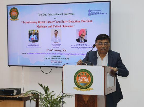 ਬਠਿੰਡਾ, 17 ਫ਼ਰਵਰੀ 2026: ਪੰਜਾਬ ਕੇਂਦਰੀ ਯੂਨੀਵਰਸਿਟੀ ਵਿਖੇ ਦੋ ਦਿਨਾਂ ਡੀਐਸਟੀ-ਪਰਸ ਅੰਤਰਰਾਸ਼ਟਰੀ ਛਾਤੀ ਦੇ ਕੈਂਸਰ ਸੰਬੰਧੀ ਕਾਨਫਰੰਸ “ਟ੍ਰਾਂਸਫਾਰਮਿੰਗ ਬ੍ਰੈਸਟ ਕੈਂਸਰ ਕੇਅਰ: ਅਰਲੀ ਡਿਟੈਕਸ਼ਨ, ਪ੍ਰਿਸੀਜ਼ਨ ਮੈਡੀਸਿਨ ਐਂਡ ਪੇਸ਼ੈਂਟ ਆਉਟਕਮਜ਼” ਦਾ ਮੰਗਲਵਾਰ ਨੂੰ ਉਦਘਾਟਨੀ ਸਮਾਗਮ ਕਰਵਾਇਆ ਗਿਆ। ਵਾਇਸ ਚਾਂਸਲਰ ਪ੍ਰੋ. ਰਾਘਵੇਂਦਰ ਪ੍ਰਸਾਦ ਤਿਵਾੜੀ ਦੀ ਸਰਪ੍ਰਸਤੀ ਹੇਠ ਕਰਵਾਈ ਇਸ ਕਾਨਫਰੰਸ ਦੇ ਉਦਘਾਟਨੀ ਸਮਾਰੋਹ ਵਿੱਚ ਐਮਜ਼ ਬਠਿੰਡਾ ਦੇ ਕਾਰਜਕਾਰੀ ਨਿਰਦੇਸ਼ਕ ਡਾ. ਰਤਨ ਗੁਪਤਾ ਮੁੱਖ ਮਹਿਮਾਨ ਵਜੋਂ ਅਤੇ ਗੁਰੂ ਨਾਨਕ ਦੇਵ ਯੂਨੀਵਰਸਿਟੀ ਦੇ ਸਾਬਕਾ ਵਾਇਸ ਚਾਂਸਲਰ ਅਤੇ ਪੰਜਾਬ ਕੇਂਦਰੀ ਯੂਨੀਵਰਸਿਟੀ ਦੇ ਸੰਸਥਾਪਕ ਵਾਇਸ ਚਾਂਸਲਰ ਪ੍ਰੋ. ਜੈ ਰੂਪ ਸਿੰਘ ਵਿਸ਼ੇਸ਼ ਮਹਿਮਾਨ ਵਜੋਂ ਸ਼ਾਮਲ ਹੋਏ। ਕਾਨਫਰੰਸ ਵਿੱਚ ਭਾਰਤ, ਚੀਨ ਅਤੇ ਯੂਨਾਈਟਿਡ ਕਿੰਗਡਮ ਦੇ ਪ੍ਰਸਿੱਧ ਵਿਗਿਆਨੀਆਂ ਅਤੇ ਖੋਜਕਾਰਾਂ ਨੇ ਭਾਗ ਲਿਆ। ਮੈਕਸ ਹਸਪਤਾਲ ਬਠਿੰਡਾ ਦੇ ਉਪ-ਨਿਰਦੇਸ਼ਕ ਡਾ. ਰਾਜੇਸ਼ ਵਸ਼ਿਸ਼ਠਾ ਵੀ ਮੌਜੂਦ ਰਹੇ।