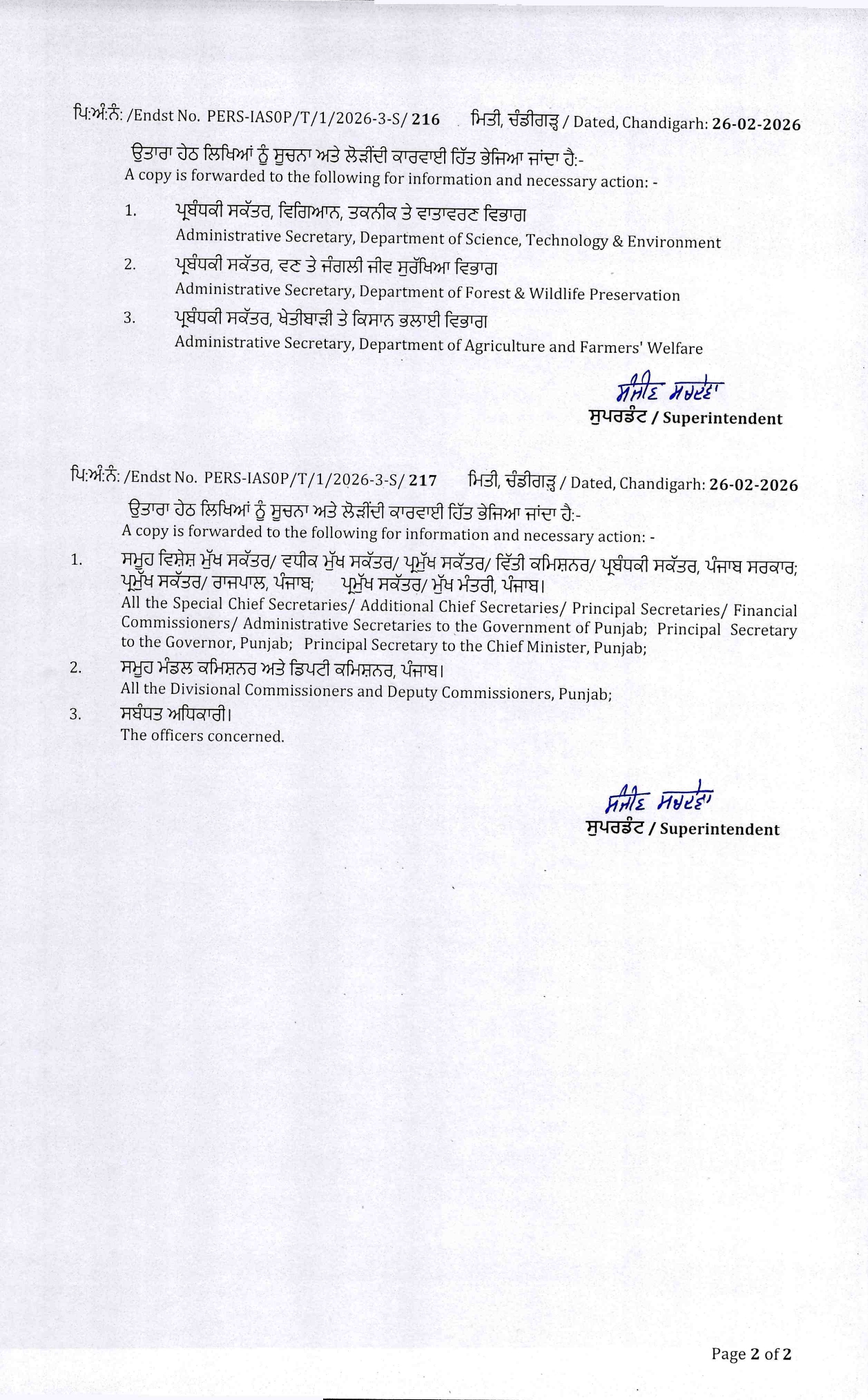 ਚੰਡੀਗੜ੍ਹ, 26 ਫ਼ਰਵਰੀ 2026 : ਪੰਜਾਬ ਸਰਕਾਰ ਵਲੋਂ ਹੁਕਮ ਜਾਰੀ ਕਰ ਕੇ 2 IFS ਅਫ਼ਸਰਾਂ ਦੀਆਂ ਬਦਲੀਆਂ ਕੀਤੀਆਂ ਗਈਆਂ ਹਨ।