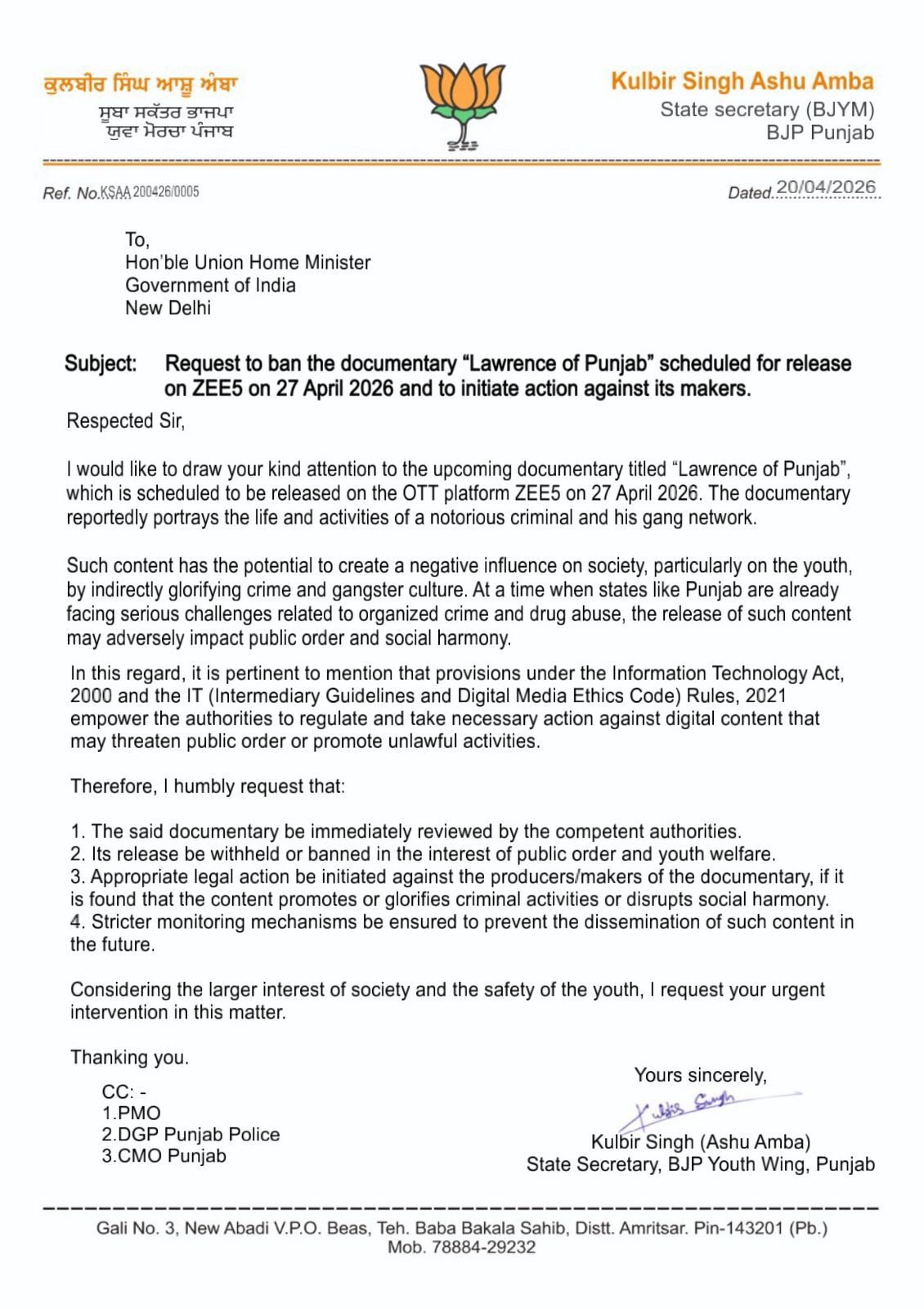 ਪੰਜਾਬ ਵਿੱਚ ਇਸ ਸਮੇਂ ਗੈਂਗਸਟਰ ਕਲਚਰ ਦੇ ਪ੍ਰਭਾਵ ਨੂੰ ਲੈ ਕੇ ਸਿਆਸੀ ਅਤੇ ਸਮਾਜਿਕ ਹਲਕਿਆਂ ਵਿੱਚ ਵੱਡੀ ਚਰਚਾ ਛਿੜੀ ਹੋਈ ਹੈ, ਜਿਸ ਦੇ ਚੱਲਦਿਆਂ ਭਾਜਪਾ ਯੁਵਾ ਮੋਰਚਾ ਪੰਜਾਬ ਦੇ ਸੂਬਾ ਸਕੱਤਰ ਕੁਲਬੀਰ ਸਿੰਘ (ਆਸ਼ੂ ਅੰਬਾ) ਨੇ ਇੱਕ ਵਿਵਾਦਿਤ ਡਾਕੂਮੈਂਟਰੀ ਫਿਲਮ ‘Lawrence of Punjab’ ਦੇ ਪ੍ਰਸਾਰਣ ਨੂੰ ਲੈ ਕੇ ਸਖ਼ਤ ਇਤਰਾਜ਼ ਜਤਾਇਆ ਹੈ। ਉਨ੍ਹਾਂ ਨੇ ਕੇਂਦਰ ਸਰਕਾਰ ਨੂੰ ਪੱਤਰ ਲਿਖ ਕੇ ਇਸ ਡਾਕੂਮੈਂਟਰੀ 'ਤੇ ਤੁਰੰਤ ਰੋਕ ਲਗਾਉਣ ਦੀ ਮੰਗ ਕੀਤੀ ਹੈ। ਆਸ਼ੂ ਅੰਬਾ ਦਾ ਸਪੱਸ਼ਟ ਮੰਨਣਾ ਹੈ ਕਿ ਅਜਿਹੀ ਸਮੱਗਰੀ ਪੰਜਾਬ ਦੇ ਨੌਜਵਾਨਾਂ ਨੂੰ ਗਲਤ ਰਸਤੇ ਵੱਲ ਧੱਕ ਸਕਦੀ ਹੈ ਅਤੇ ਸਿੱਧੇ ਤੌਰ 'ਤੇ 'Gangsterism' ਨੂੰ ਪ੍ਰਮੋਟ ਕਰਨ ਦਾ ਕੰਮ ਕਰੇਗੀ, ਜੋ ਕਿ ਸੂਬੇ ਦੀ ਅਮਨ-ਸ਼ਾਂਤੀ ਲਈ ਖ਼ਤਰਾ ਹੈ।