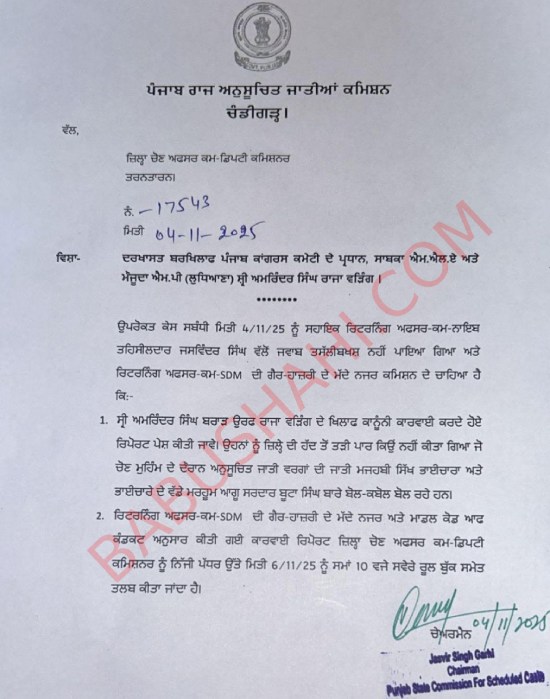 ਚੰਡੀਗੜ੍ਹ, 4 ਨਵੰਬਰ 2025- ਕਾਂਗਰਸ ਪ੍ਰਧਾਨ ਰਾਜਾ ਵੜਿੰਗ ਦੇ ਮਸਲੇ ਤੇ ਐਸਸੀ ਕਮਿਸ਼ਨ ਦੇ ਵੱਲੋਂ ਡੀਸੀ-ਕਮ-ਡੀਈਓ ਨੂੰ ਸੰਮਨ ਜਾਰੀ ਕੀਤੇ ਹਨ। ਆਪਣੇ ਸੰਮਨ ਵਿੱਚ ਕਮਿਸ਼ਨ ਨੇ ਡੀਸੀ-ਕਮ-ਡੀਈਓ ਨੂੰ ਲਿਖਿਆ ਹੈ ਕਿ Warring ਨੂੰ ਤੜੀਪਾਰ ਕਿਉਂ ਨਹੀਂ ਕੀਤਾ?