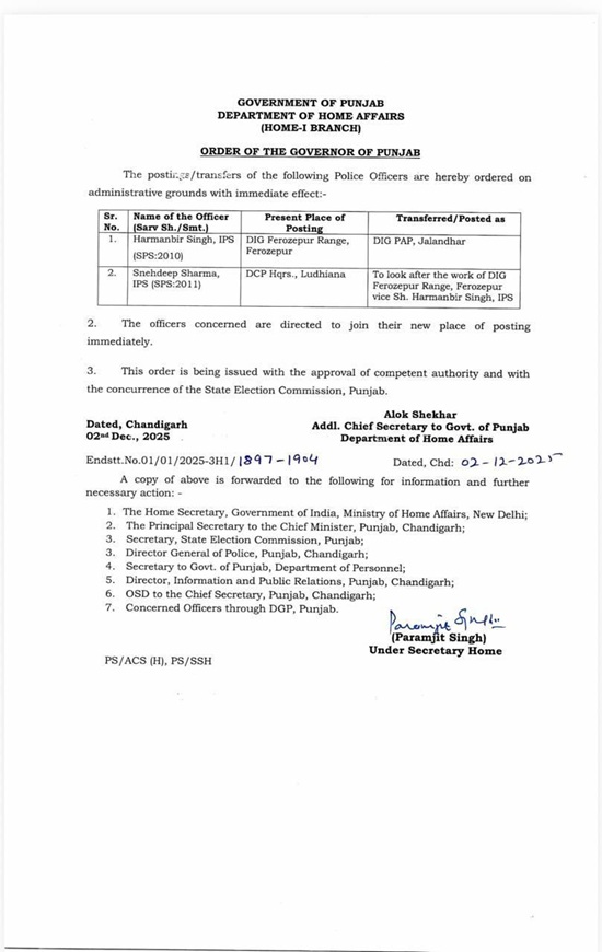 ਚੰਡੀਗੜ੍ਹ, 2 ਦਸੰਬਰ, 2025: ਪੰਜਾਬ ਸਰਕਾਰ (Punjab Government) ਨੇ ਤੁਰੰਤ ਪ੍ਰਭਾਵ ਨਾਲ ਦੋ ਆਈਪੀਐਸ (IPS) ਅਫ਼ਸਰਾਂ ਦਾ ਤਬਾਦਲਾ ਕਰ ਦਿੱਤਾ ਹੈ।