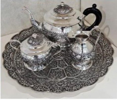 2. ਸਜਾਵਟੀ ਚਾਂਦੀ ਦਾ ਚਾਹ ਸੈੱਟ (Silver Tea Set) ਦੂਜਾ ਤੋਹਫ਼ਾ ਪੱਛਮੀ ਬੰਗਾਲ (West Bengal) ਅਤੇ ਮੁਰਸ਼ਿਦਾਬਾਦ ਦੀ ਬਿਹਤਰੀਨ ਕਾਰੀਗਰੀ ਦਾ ਨਮੂਨਾ ਸੀ—ਇੱਕ ਸਜਾਵਟੀ ਚਾਂਦੀ ਦਾ ਟੀ-ਸੈੱਟ। ਇਹ ਚਾਂਦੀ ਦਾ ਸੈੱਟ ਦੋਵਾਂ ਦੇਸ਼ਾਂ ਦੀ 'ਸਾਂਝੀ ਪਰੰਪਰਾ' ਅਤੇ ਰਿਸ਼ਤਿਆਂ ਦੀ ਗਰਮਾਹਟ ਨੂੰ ਬਿਆਨ ਕਰਦਾ ਹੈ।