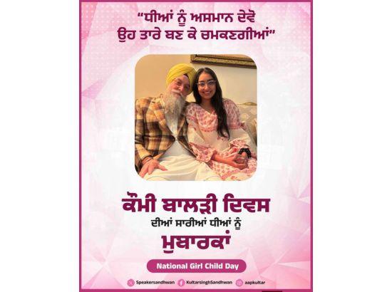 ਸਪੀਕਰ ਵੱਲੋਂ ਕੌਮੀ ਬਾਲੜੀ ਦਿਵਸ ਮੌਕੇ 'ਤੇ ਸਾਰੀਆਂ ਧੀਆਂ ਨੂੰ ਨਿੱਘੀਆਂ ਸ਼ੁਭਕਾਮਨਾਵਾਂ