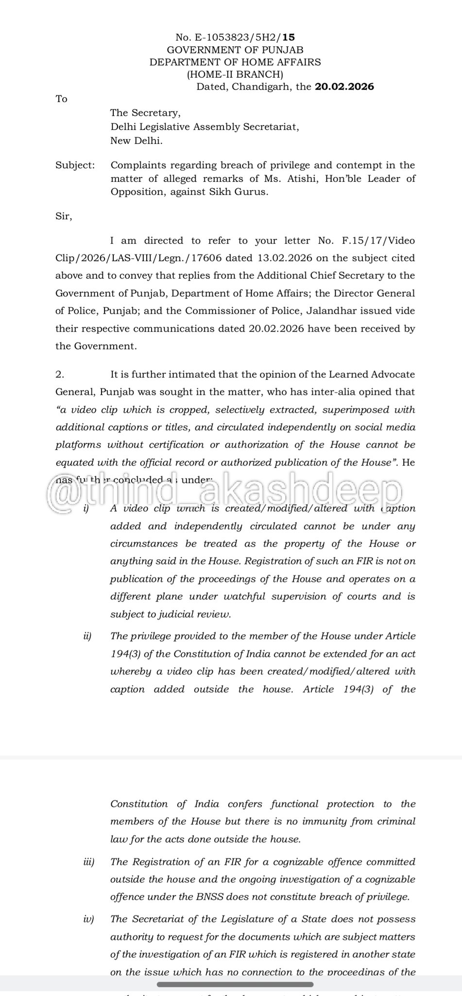 ਪੰਜਾਬ ਦੇ ਗ੍ਰਹਿ ਮਾਮਲਿਆਂ ਦੇ ਵਿਭਾਗ ਨੇ ਦਿੱਲੀ ਵਿਧਾਨ ਸਭਾ ਨੂੰ ਇੱਕ ਅਹਿਮ ਜਵਾਬ ਭੇਜਦਿਆਂ ਸਪੱਸ਼ਟ ਕੀਤਾ ਹੈ ਕਿ ਸੋਸ਼ਲ ਮੀਡੀਆ 'ਤੇ ਵਾਇਰਲ ਹੋ ਰਹੀ ਵਿਵਾਦਤ ਵੀਡੀਓ ਕਲਿੱਪ ਵਿਧਾਨ ਸਭਾ ਦੀ ਅਧਿਕਾਰਤ ਕਾਰਵਾਈ ਦਾ ਹਿੱਸਾ ਨਹੀਂ ਹੈ। ਪੰਜਾਬ ਸਰਕਾਰ ਨੇ ਤਰਕ ਦਿੱਤਾ ਹੈ ਕਿ ਅਜਿਹੀਆਂ ਵੀਡੀਓਜ਼, ਜੋ ਸੰਪਾਦਿਤ (Edit) ਕੀਤੀਆਂ ਗਈਆਂ ਹਨ ਜਾਂ ਜਿਨ੍ਹਾਂ ਨਾਲ ਛੇੜਛਾੜ ਕੀਤੀ ਗਈ ਹੈ, ਕਿਸੇ ਵੀ ਤਰ੍ਹਾਂ ਦੀ ਕਾਨੂੰਨੀ ਜਾਂ ਵਿਸ਼ੇਸ਼ ਅਧਿਕਾਰ ਸੁਰੱਖਿਆ (Privilege Protection) ਦੇ ਅਧੀਨ ਨਹੀਂ ਆਉਂਦੀਆਂ।