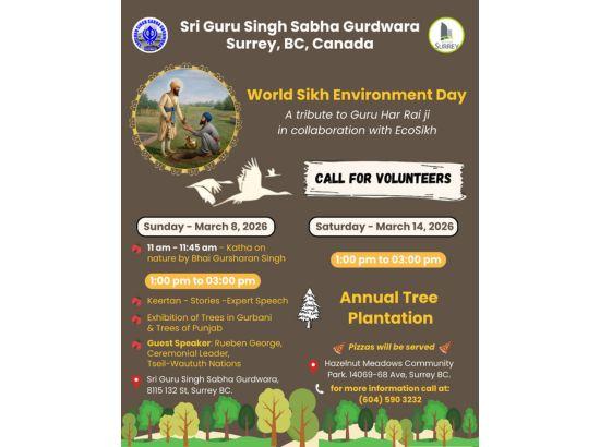 ਸਰੀ, 5 ਮਾਰਚ 2026- ਸ੍ਰੀ ਗੁਰੂ ਸਿੰਘ ਸਭਾ ਗੁਰਦੁਆਰਾ ਸਰੀ ਵੱਲੋਂ ਸਿਟੀ ਆਫ਼ ਸਰੀ ਅਤੇ ਈਕੋਸਿੱਖ ਦੇ ਸਹਿਯੋਗ ਨਾਲ ਸੱਤਵੇਂ ਪਾਤਸ਼ਾਹ ਸ੍ਰੀ ਗੁਰੂ ਹਰਿ ਰਾਇ ਜੀ ਦੇ ਪ੍ਰਕਾਸ਼ ਪੁਰਬ ਨੂੰ ਸਮਰਪਿਤ ‘ਵਿਸ਼ਵ ਸਿੱਖ ਵਾਤਾਵਰਣ ਦਿਵਸ’ ਬੜੀ ਸ਼ਰਧਾ ਨਾਲ ਮਨਾਇਆ ਜਾ ਰਿਹਾ ਹੈ। ਇਸ ਸਬੰਧੀ ਗੁਰਦੁਆਰਾ ਸਾਹਿਬ ਵਿਖੇ ਵਿਸ਼ੇਸ਼ ਧਾਰਮਿਕ ਸਮਾਗਮ ਅਤੇ ਸਾਲਾਨਾ ਰੁੱਖ ਲਗਾਉਣ ਦੀ ਮੁਹਿੰਮ ਉਲੀਕੀ ਗਈ ਹੈ।