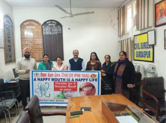 ਸਿਵਲ ਸਰਜਨ ਗੁਰਦਾਸਪੁਰ ਡਾਕਟਰ ਮਹੇਸ਼ ਕੁਮਾਰ ਪ੍ਰਭਾਕਰ ਦੀ ਅਗੁਵਾਈ ਹੇਠ ਵਰਲਡ ਓਰਲ ਹੈਲਥ ਡੇ 2026 ਮਨਾਓਨ ਸਬੰਧੀ ਪੋਸਟਰ ਦਫਤਰ ਸਿਵਲ ਸਰਜਨ ਵਿਖੇ ਜਾਰੀ ਕੀਤਾ ਗਿਆ। ਜਿਸ ਦਾ Theme ਹੈ "A Happy Mouth is a Happy Life" .ਇਸ ਮੌਕੇ ਡਿਪਟੀ ਡਾਇਰੈਕਟਰ ਕਮ ਡੀ ਡੀ ਐੱਚ ਓ ਡਾਕਟਰ ਵਿਨੋਦ ਭਗਤ ਜੀ ਨੇ ਦੱਸਿਆ ਅੱਜ ਦੁਨੀਆ ਭਰ ਵਿੱਚ 20 ਮਾਰਚ ਨੂੰ ਵਿਸ਼ਵ ਓਰਲ ਹੈਲਥ ਡੇ ਮਨਾਇਆ ਜਾ ਰਿਹਾ ਹੈ। ਇਸ ਦਿਨ ਦਾ ਉਦੇਸ਼ ਲੋਕਾਂ ਵਿੱਚ ਮੂੰਹ ਅਤੇ ਦੰਦਾਂ ਦੀ ਸਿਹਤ ਬਾਰੇ ਜਾਗਰੂਕਤਾ ਫੈਲਾਉਣਾ ਹੈ। ਸਿਹਤਮੰਦ ਦੰਦ ਅਤੇ ਮੂੰਹ ਸਿਰਫ਼ ਸੁੰਦਰ ਮੁਸਕਾਨ ਲਈ ਹੀ ਨਹੀਂ, ਸਗੋਂ ਸਮੁੱਚੀ ਸਿਹਤ ਲਈ ਵੀ ਬਹੁਤ ਜ਼ਰੂਰੀ ਹਨ। ਦੰਦਾ ਪ੍ਰਤੀ ਇੱਕ ਮਹੀਨਾ ਜਾਗਰੂਕ ਕਰਨ ਲਈ ਵੱਖ ਵੱਖ ਗਤੀਵਿਧੀਆ ਕੀਤੀਆ ਜਾਣਿਆ ਹੈ ਜਿਵੇ ਕਿ ਪੋਸਟਰ ਮੇਕਿੰਗ ਮੁਕਾਬਲਾ, ਰੰਗੋਲੀ ਮੁਕਾਬਲਾ ਅਤੇ ਵੱਖ ਵੱਖ ਕੈਂਪ ਆਯੋਜਿਤ ਕੀਤੇ ਜਾਣਗੇ। ਓਹਨਾ ਦਸਿਆ ਕਿ ਹਰ ਛੇ ਮਹੀਨੇ ਬਾਦ ਡਾਕਟਰ ਤੋਂ ਚੈਕ ਅੱਪ ਆਪਣੇ ਨੇੜਲੇ ਸਰਕਾਰੀ ਸੰਸਥਾ ਕਰਵਾਣਾ ਚਾਹੀਦਾ ਹੈ। ਜੇਕਰ ਸਾਡਾ ਮੂੰਹ ਸਵਸਥ ਹੈ ਤਾਂ ਸਾਡੀ ਜਿੰਦਗੀ ਭੀ ਖੁਸ਼ਹਾਲ ਹੈ।