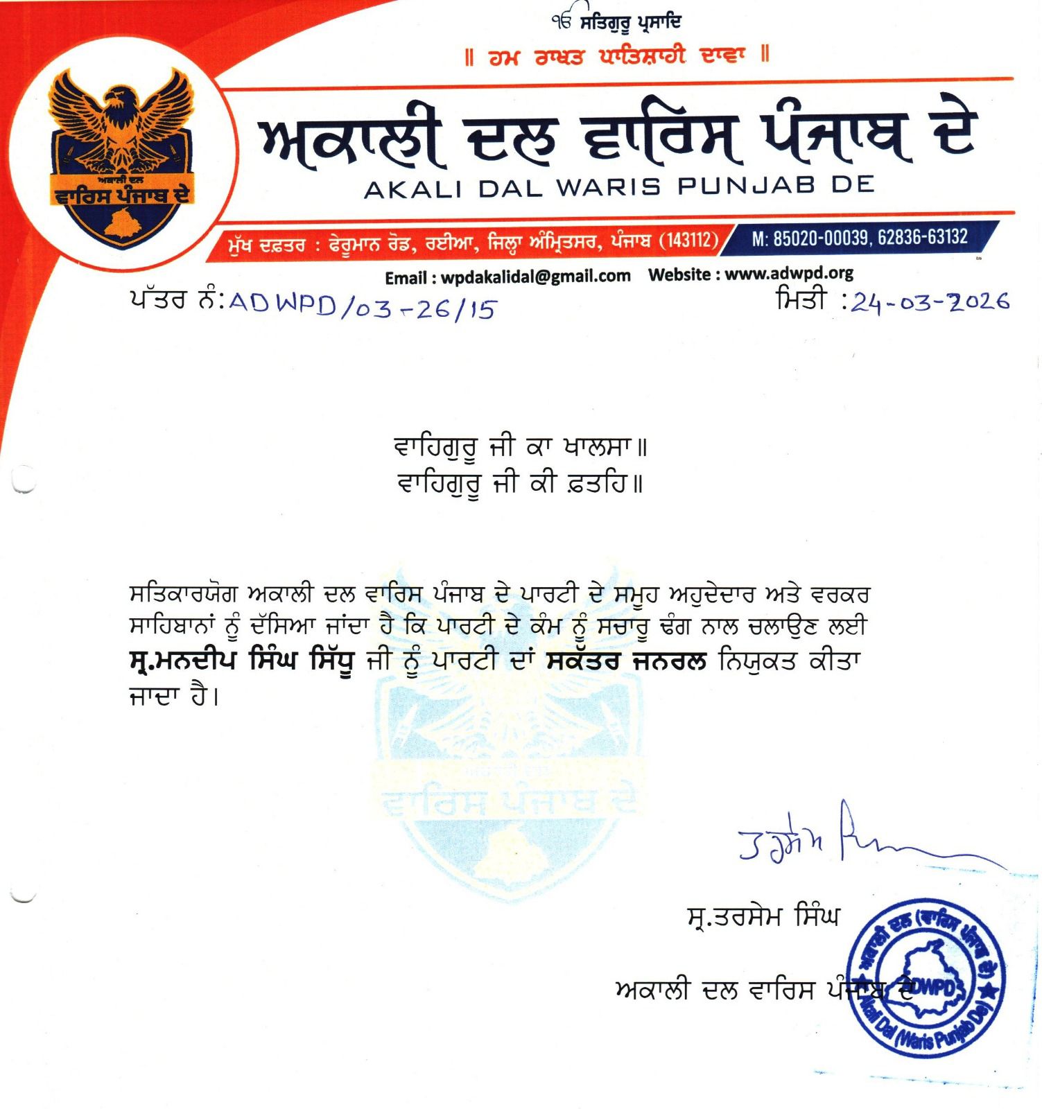 ਚੰਡੀਗੜ੍ਹ, 25 ਮਾਰਚ 2026 : ਮਨਦੀਪ ਸਿੰਘ ਸਿੱਧੂ ਨੂੰ ਵਾਰਿਸ ਪੰਜਾਬ ਦੇ ਪਾਰਟੀ 'ਚ ਜਰਨਲ ਸਕੱਤਰ ਨਿਯੁਕਤ ਕੀਤਾ ਗਿਆ ਹੈ।