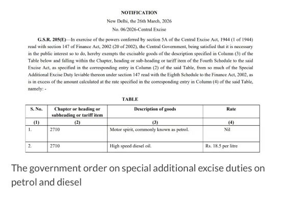 ਨਵੀਂ ਦਿੱਲੀ, 27 ਮਾਰਚ, 2026: ਭਾਰਤ ਸਰਕਾਰ ਨੇ ਪੈਟਰੋਲ ’ਤੇ ਐਡੀਸ਼ਨਲ ਐਕਸਾਈਜ਼ ਡਿਊਟੀ 13 ਰੁਪਏ ਤੋਂ ਘਟਾ ਕੇ 3 ਰੁਪੲ ਅਤੇ ਡੀਜ਼ਲ ’ਤੇ 10 ਰੁਪਏ ਤੋਂ ਘਟਾ ਕੇ ਜ਼ੀਰੋ ਕਰ ਦਿੱਤੀ ਹੈ।ਇਸ ਡਿਊਟੀ ਕਟੌਤੀ ਦਾ ਮਕਸਦ ਤੇਲ ਕੰਪਨੀਆਂ ਨੂੰ ਰਾਹਤ ਦੇਣਾ ਹੈ ਕਿਉਂਕਿ ਕੌਮਾਂਤਰੀ ਬਜ਼ਾਰ ਵਿਚ ਤੇਲ ਦੀਆਂ ਕੀਮਤਾਂ ਪੱਛਮੀ ਏਸ਼ੀਆ ਯੁੱਧ ਕਾਰਨ ਵੱਧ ਰਹੀਆਂ ਹਨ।