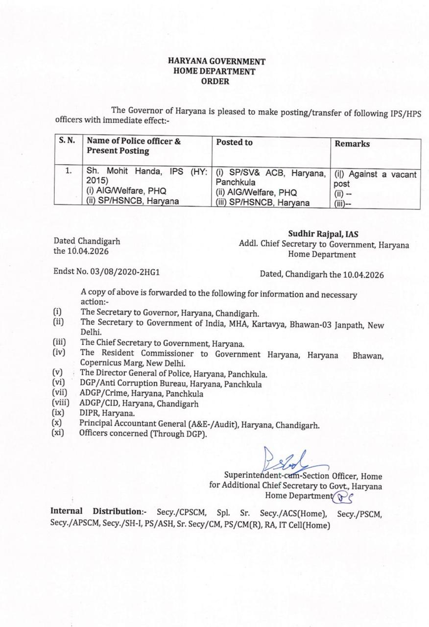 ਚੰਡੀਗੜ੍ਹ, 10 ਅਪ੍ਰੈਲ 2026 : ਹਰਿਆਣਾ ਸਰਕਾਰ ਨੇ ਹੁਕਮ ਜਾਰੀ ਕਰ ਕੇ ਇੱਕ ਆਈ ਪੀ ਐਸ ਅਫ਼ਸਰ ਦਾ ਤਬਾਦਲਾ ਕੀਤਾ ਹੈ। ਹੇਠਾਂ ਪੜ੍ਹੋ ਡਿਟੇਲ :