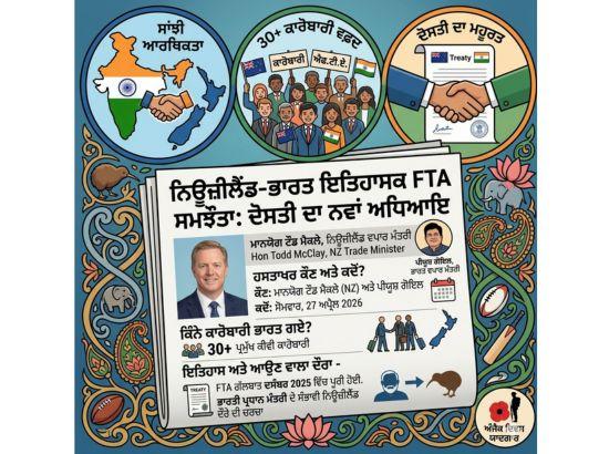 ਔਕਲੈਂਡ, 24 ਅਪ੍ਰੈਲ, 2026: ਨਿਊਜ਼ੀਲੈਂਡ ਅਤੇ ਭਾਰਤ ਵਿਚਾਲੇ ਇਤਿਹਾਸਕ ਮੁਕਤ ਵਪਾਰ ਸਮਝੌਤਾ (FTA), ਜੋ ਕਿ ਆਰਥਿਕ ਦੋਸਤੀ ਦਾ ਨਵਾਂ ਅਧਿਆਇ ਹੈ, ਅਗਲੇ ਸੋਮਵਾਰ ਤੋਂ ਪ੍ਰਵਾਨ ਚੜ੍ਹਨ ਜਾ ਰਿਹਾ ਹੈ। ਕਈ ਤਰ੍ਹਾਂ ਦੀਆਂ ਅਟਕਲਾਂ ਦੇ ਬਾਵਜੂਦ, ਨਿਊਜ਼ੀਲੈਂਡ ਅਤੇ ਭਾਰਤ ਦੇ ਸਬੰਧਾਂ ਵਿੱਚ ਇੱਕ ਸੁਨਹਿਰੀ ਮੋੜ ਆ ਗਿਆ ਹੈ। ਦੋਵਾਂ ਦੇਸ਼ਾਂ ਵਿਚਾਲੇ ਲੰਬੇ ਸਮੇਂ ਤੋਂ ਉਡੀਕੇ ਜਾ ਰਹੇ ਇਸ ਸਮਝੌਤੇ ’ਤੇ ਹਸਤਾਖਰ ਹੋਣ ਜਾ ਰਹੇ ਹਨ, ਜੋ ਕਿ ਦੋਵਾਂ ਮੁਲਕਾਂ ਦੀ ਆਰਥਿਕਤਾ ਲਈ ਇੱਕ ਵੱਡੀ ਉਪਲਬਧੀ ਮੰਨਿਆ ਜਾ ਰਿਹਾ ਹੈ।