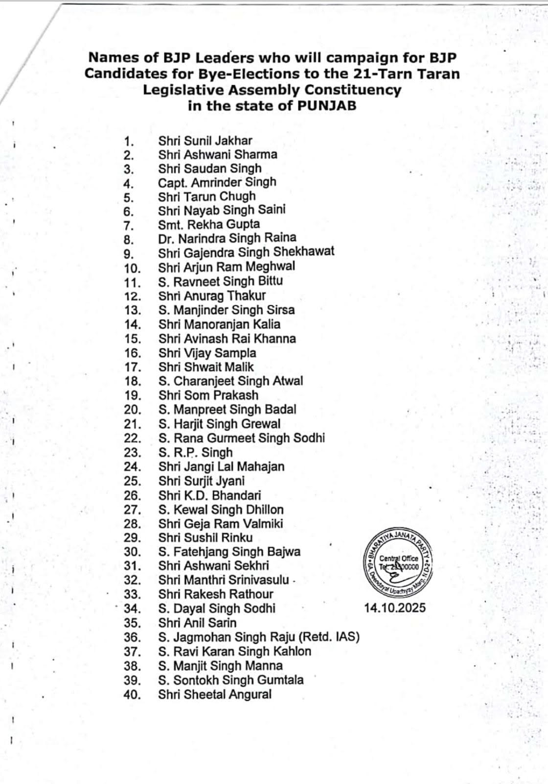 14 October 2025 : Tarn Taran By Poll : ਭਾਜਪਾ ਨੇ ਕੇਂਦਰੀ ਮੰਤਰੀਆਂ ਸਮੇਤ ਐਲਾਨੇ 40 ਚੋਣ ਪ੍ਰਚਾਰਕ