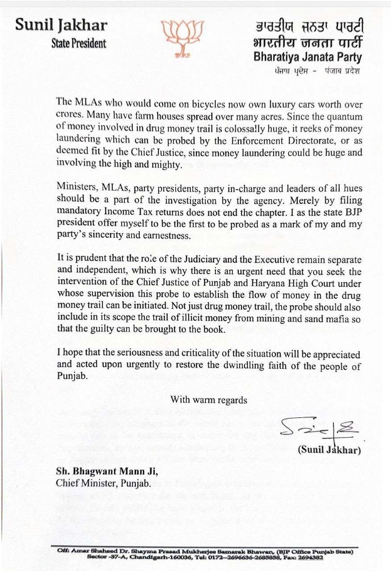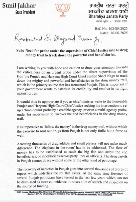 16 ਜੂਨ, 2025 ਨੂੰ ਲਿਖੇ ਆਪਣੇ ਵਿਸਥਾਰਤ ਪੱਤਰ ਵਿੱਚ ਜਾਖੜ ਨੇ ਮੁੱਖ ਮੰਤਰੀ ਨੂੰ ਅਪੀਲ ਕੀਤੀ ਕਿ ਉਹ ਹਾਈਕੋਰਟ ਨੂੰ ਬੇਨਤੀ ਕਰਨ ਕਿ ਚੀਫ਼ ਜਸਟਿਸ ਸ਼ੀਲ ਨਾਗੂ (Chief Justice Sheel Nagu) ਦੀ ਅਗਵਾਈ ਵਿੱਚ ਡਰੱਗ ਮਨੀ ਟ੍ਰੇਲ ਦੀ ਜਾਂਚ ਸ਼ੁਰੂ ਕੀਤੀ ਜਾਵੇ, ਤਾਂ ਜੋ 'ਅਸਲੀ ਅਤੇ ਤਾਕਤਵਰ ਲਾਭਪਾਤਰੀਆਂ' ਦਾ ਪਤਾ ਲਗਾਇਆ ਜਾ ਸਕੇ। ਜਾਖੜ ਨੇ ਲਿਖਿਆ ਕਿ ਕੇਵਲ ਛੋਟੇ ਨਸ਼ਾ ਤਸਕਰਾਂ ਜਾਂ ਨਸ਼ੇੜੀਆਂ ਨੂੰ ਗ੍ਰਿਫ਼ਤਾਰ ਕਰਨ ਨਾਲ ਕੁਝ ਹੱਲ ਨਹੀਂ ਹੋਵੇਗਾ। ਇਸ ਦੀ ਬਜਾਏ, ਸੂਬੇ ਨੂੰ ਉਨ੍ਹਾਂ ਵੱਡੇ ਖਿਡਾਰੀਆਂ ਦੀ ਪਛਾਣ ਕਰਨੀ ਚਾਹੀਦੀ ਹੈ ਜੋ ਡਰੱਗ ਨੈੱਟਵਰਕ ਨੂੰ ਫਾਈਨਾਂਸ (Finance) ਕਰ ਰਹੇ ਹਨ।