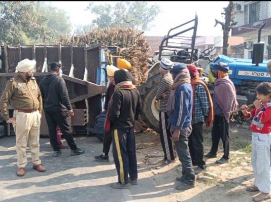 ਸੜਕ ਦੇ ਅੱਧ ਵਿੱਚਕਾਰ ਗੰਨਿਆਂ ਦੀ ਟਰਾਲੀ ਪਲਟਣ ਨਾਲ ਆਵਾਜਾਈ ਵਿੱਚ ਪਿਆ ਵਿਘਨ