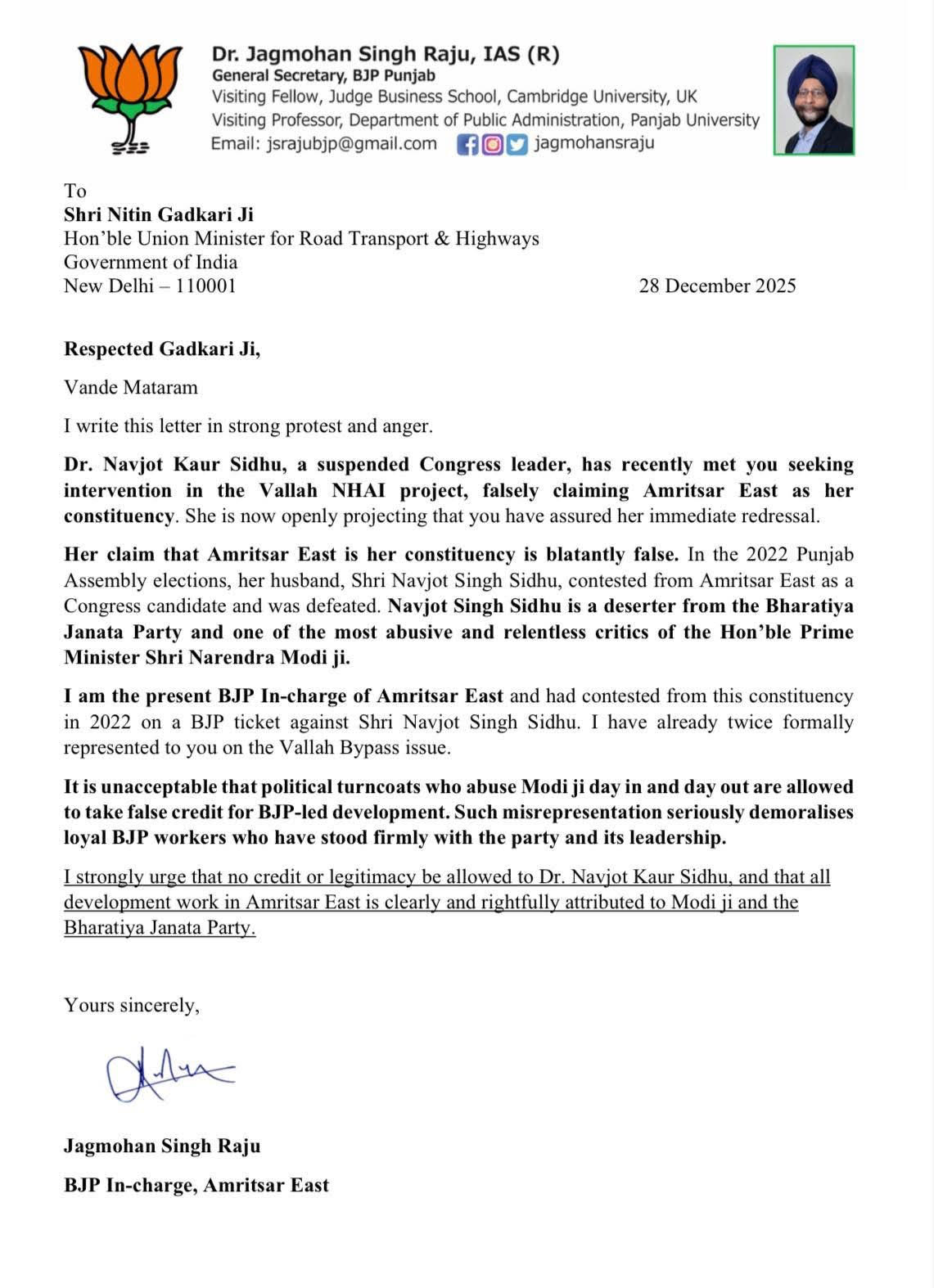 ਅੰਮ੍ਰਿਤਸਰ/ਦਿੱਲੀ (28 ਦਸੰਬਰ, 2025): ਸਾਬਕਾ ਵਿਧਾਇਕਾ ਡਾ. ਨਵਜੋਤ ਕੌਰ ਸਿੱਧੂ ਵੱਲੋਂ ਕੇਂਦਰੀ ਮੰਤਰੀ ਨਿਤਿਨ ਗਡਕਰੀ ਨਾਲ ਕੀਤੀ ਗਈ ਮੁਲਾਕਾਤ ਨੇ ਸਿਆਸੀ ਹਲਕਿਆਂ ਵਿੱਚ ਵੱਡਾ ਵਿਵਾਦ ਖੜ੍ਹਾ ਕਰ ਦਿੱਤਾ ਹੈ। ਭਾਜਪਾ ਪੰਜਾਬ ਦੇ ਜਨਰਲ ਸਕੱਤਰ ਅਤੇ ਅੰਮ੍ਰਿਤਸਰ ਪੂਰਬੀ ਦੇ ਇੰਚਾਰਜ ਡਾ. ਜਗਮੋਹਨ ਸਿੰਘ ਰਾਜੂ ਨੇ ਇਸ ਮੁਲਾਕਾਤ 'ਤੇ ਸਖ਼ਤ ਨਾਰਾਜ਼ਗੀ ਜ਼ਾਹਰ ਕਰਦਿਆਂ ਕੇਂਦਰੀ ਮੰਤਰੀ ਨੂੰ ਇੱਕ ਵਿਰੋਧ ਪੱਤਰ ਲਿਖਿਆ ਹੈ।