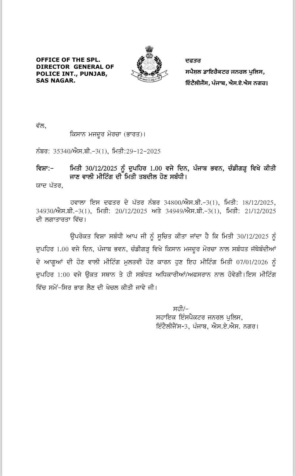 ਚੰਡੀਗੜ੍ਹ, 30 ਦਸੰਬਰ 2025 : ਕਿਸਾਨਾਂ ਨਾਲ ਪੰਜਾਬ ਸਰਕਾਰ ਦੀ ਅੱਜ ਹੋਣ ਵਾਲੀ ਮੀਟਿੰਗ ਮੁਲਤਵੀ ਕਰ ਦਿੱਤੀ ਗਈ ਹੈ। ਜਿਕਰਯੋਗ ਹੈ ਕਿ ਇਹ ਮੀਟਿੰਗ 30/12/2025 ਨੂੰ ਚੰਡੀਗੜ੍ਹ ਸਥਿਤ ਪੰਜਾਬ ਭਵਨ ਹੋਣੀ ਸੀ, ਜੋ ਕਿ ਹੁਣ 7 ਜਨਵਰੀ 2026 ਨੂੰ ਹੋਵੇਗੀ