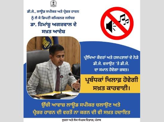 ਜਲੰਧਰ, 19 ਫਰਵਰੀ : ਡਿਪਟੀ ਕਮਿਸ਼ਨਰ ਡਾ. ਹਿਮਾਂਸ਼ੂ ਅਗਰਵਾਲ ਨੇ ਵਿਦਿਆਰਥੀਆਂ ਅਤੇ ਮਰੀਜ਼ਾਂ ਲਈ ਸ਼ਾਂਤਮਈ ਮਾਹੌਲ ਯਕੀਨੀ ਬਣਾਉਣ ਲਈ ਵਿੱਦਿਅਕ ਸੰਸਥਾਵਾਂ ਅਤੇ ਹਸਪਤਾਲਾਂ ਨੇੜੇ ਡੀ.ਜੇ. ਨਾ ਵਜਾਉਣ ਦੀ ਸਖ਼ਤ ਹਦਾਇਤ ਕਰਦਿਆਂ ਕਿਹਾ ਕਿ ਡੀ.ਜੇ. ਵਜਾਉਣ 'ਤੇ ਜਿੱਥੇ ਸਮਾਨ ਜ਼ਬਤ ਕੀਤਾ ਜਾਵੇਗਾ, ਉੱਥੇ ਪ੍ਰਬੰਧਕਾਂ ਖਿਲਾਫ਼ ਸਖ਼ਤ ਕਾਰਵਾਈ ਕੀਤੀ ਜਾਵੇਗੀ। ਇਸ ਤੋਂ ਇਲਾਵਾ ਉਨ੍ਹਾਂ ਉੱਚੀ ਆਵਾਜ਼ ਵਿੱਚ ਲਾਊਡ ਸਪੀਕਰਾਂ ਅਤੇ ਪ੍ਰੈਸ਼ਰ ਹਾਰਨਾਂ ਦੀ ਵਰਤੋਂ ਨਾ ਕਰਨ ਦੀ ਵੀ ਸਖ਼ਤ ਹਦਾਇਤ ਕੀਤੀ ਹੈ।