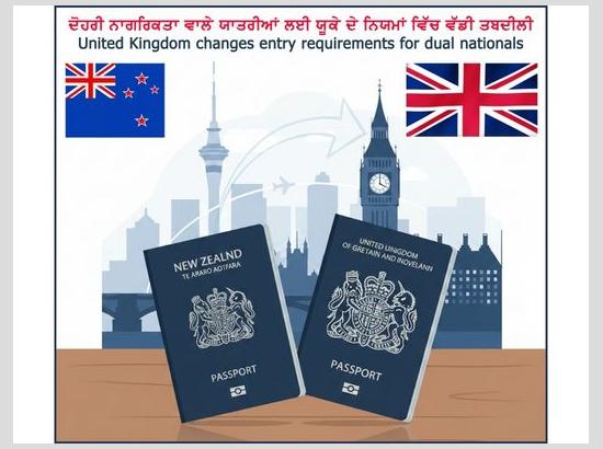 ਔਕਲੈਂਡ, 25 ਫਰਵਰੀ 2026: - ਯੂਨਾਈਟਿਡ ਕਿੰਗਡਮ (UK) ਸਰਕਾਰ ਨੇ ਦੋਹਰੀ ਨਾਗਰਿਕਤਾ ਰੱਖਣ ਵਾਲੇ ਵਿਅਕਤੀਆਂ, ਖਾਸ ਕਰਕੇ ਨਿਊਜ਼ੀਲੈਂਡ ਦੇ ਵਸਨੀਕਾਂ ਲਈ ਯਾਤਰਾ ਨਿਯਮਾਂ ਵਿੱਚ ਇੱਕ ਅਹਿਮ ਬਦਲਾਅ ਦਾ ਐਲਾਨ ਕੀਤਾ ਹੈ। 25 ਫਰਵਰੀ 2026 ਤੋਂ ਲਾਗੂ ਹੋਣ ਵਾਲੇ ਇਹ ਨਿਯਮ ਉਨ੍ਹਾਂ ਸਾਰੇ ਯਾਤਰੀਆਂ ’ਤੇ ਅਸਰ ਪਾਉਣਗੇ ਜਿਨ੍ਹਾਂ ਕੋਲ ਬ੍ਰਿਟਿਸ਼ ਜਾਂ ਆਇਰਿਸ਼ ਨਾਗਰਿਕਤਾ ਦੇ ਨਾਲ-ਨਾਲ ਕਿਸੇ ਹੋਰ ਦੇਸ਼ ਦੀ ਨਾਗਰਿਕਤਾ ਵੀ ਹੈ।