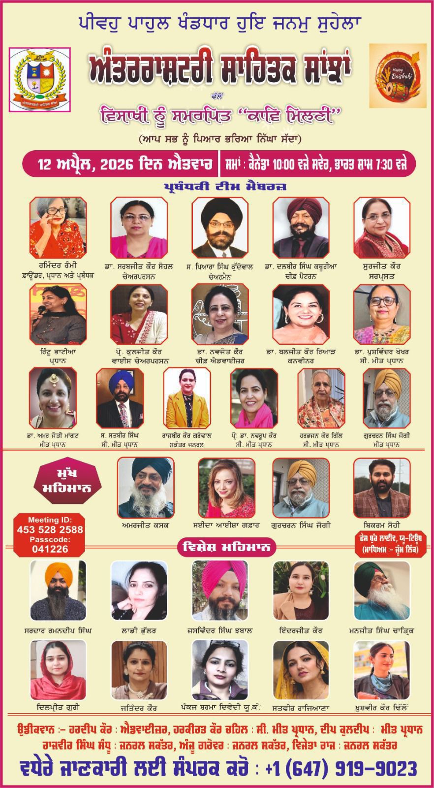 ''ਅੰਤਰਰਾਸ਼ਟਰੀ ਸਾਹਿਤਕ ਸਾਂਝਾਂ ਵੱਲੋਂ ਵਿਸਾਖੀ ਨੂੰ ਸਮਰਪਿਤ “ਅੰਤਰਰਾਸ਼ਟਰੀ ਕਾਵਿ ਮਿਲਣੀ “ਬਹੁਤ ਸਫਲ ਅਤੇ ਪ੍ਰਭਾਵਸ਼ਾਲੀ ਹੋ ਨਿਬੜੀ “