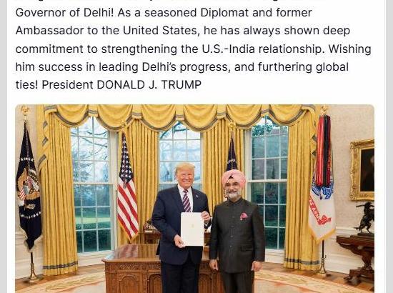 ਤਰਨਜੀਤ ਸਿੰਘ ਸੰਧੂ ਨੂੰ ਦਿੱਲੀ ਦਾ ਲੈਫਟੀਨੈਂਟ ਗਵਰਨਰ ਬਣਨ 'ਤੇ ਅਮਰੀਕੀ ਰਾਸ਼ਟਰਪਤੀ ਡੋਨਾਲਡ ਟਰੰਪ ਵੱਲੋਂ ਵਧਾਈ