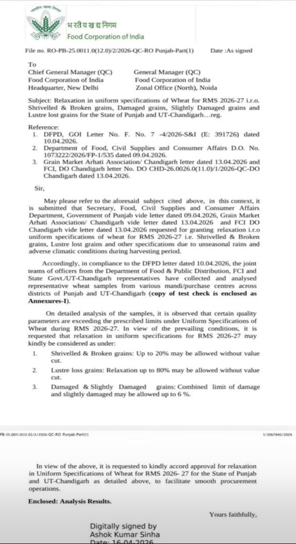 ਪੰਜਾਬ ਦੇ ਕਿਸਾਨਾਂ ਲਈ ਕਣਕ ਦੀ ਖਰੀਦ ਨੂੰ ਲੈ ਕੇ ਇੱਕ ਅਹਿਮ ਖਬਰ ਸਾਹਮਣੇ ਆਈ ਹੈ। ਫੂਡ ਕਾਰਪੋਰੇਸ਼ਨ ਆਫ ਇੰਡੀਆ (FCI) ਨੇ ਸੂਬੇ ਦੇ ਸਾਰੇ ਜ਼ਿਲ੍ਹਿਆਂ ਤੋਂ ਕਣਕ ਦੇ ਸੈਂਪਲ ਇਕੱਤਰ ਕਰਨ ਤੋਂ ਬਾਅਦ ਇੱਕ ਵਿਸਤ੍ਰਿਤ ਰਿਪੋਰਟ ਕੇਂਦਰ ਸਰਕਾਰ ਨੂੰ ਭੇਜ ਦਿੱਤੀ ਹੈ। ਇਸ ਰਿਪੋਰਟ ਵਿੱਚ ਕਣਕ ਦੀ ਫਸਲ ਨੂੰ ਹੋਏ ਨੁਕਸਾਨ ਨੂੰ ਸਪੱਸ਼ਟ ਰੂਪ ਵਿੱਚ ਦਰਸਾਇਆ ਗਿਆ ਹੈ ਅਤੇ ਖਰੀਦ ਦੇ ਮਾਪਦੰਡਾਂ (Norms) ਵਿੱਚ ਢਿੱਲ ਦੇਣ ਦੀ ਜ਼ੋਰਦਾਰ ਮੰਗ ਕੀਤੀ ਗਈ ਹੈ।