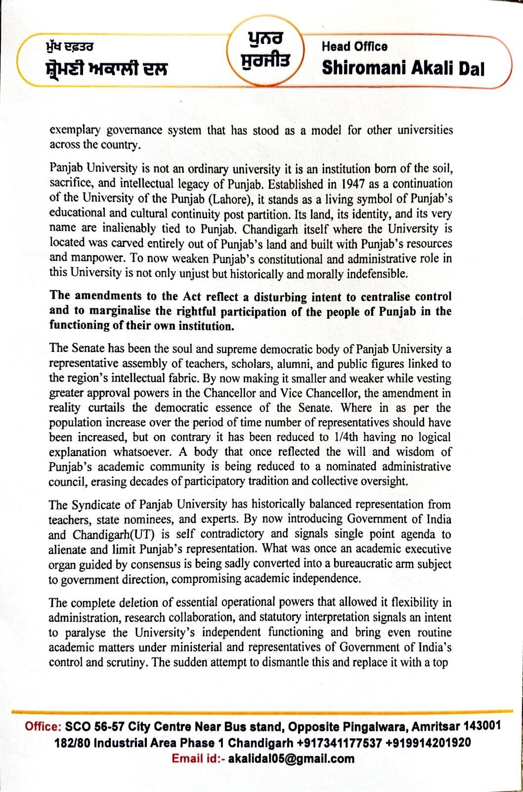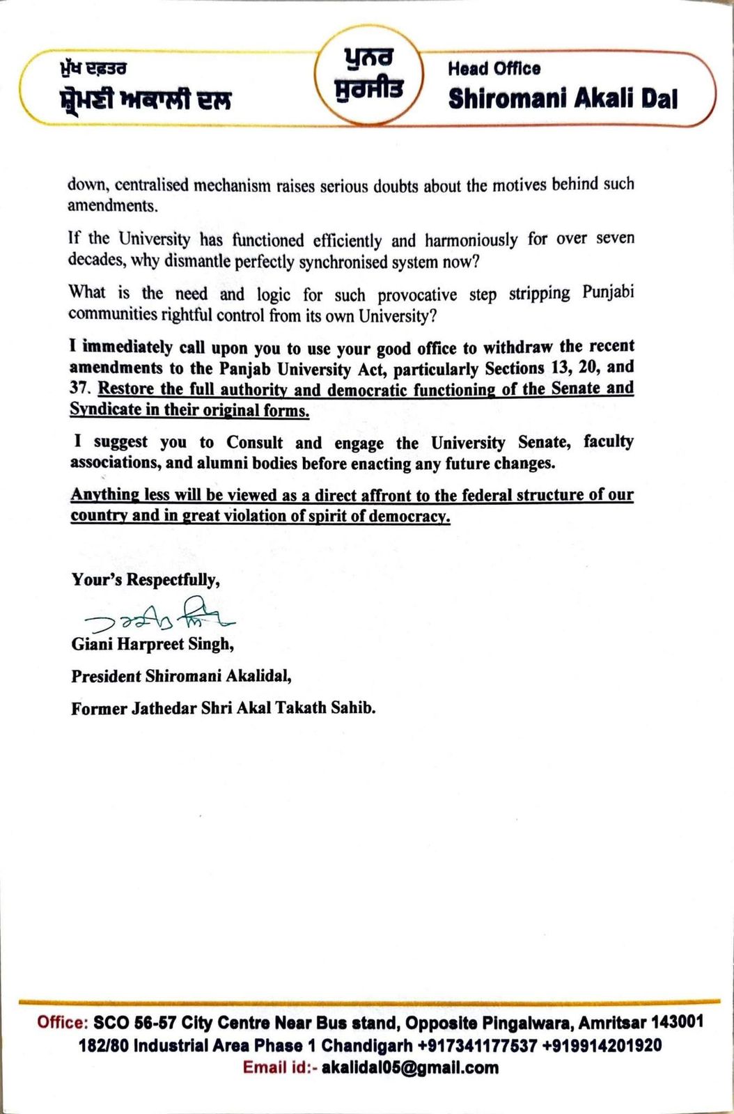 ਚੰਡੀਗੜ੍ਹ, 7 November 2025 : ਸ਼੍ਰੋਮਣੀ ਅਕਾਲੀ ਦਲ (ਪੁਨਰ ਸੁਰਜੀਤ) ਦੇ ਪ੍ਰਧਾਨ ਗਿਆਨੀ ਹਰਪ੍ਰੀਤ ਸਿੰਘ ਵੱਲੋਂ ਭਾਰਤ ਸਰਕਾਰ ਦੇ ਸਿੱਖਿਆ ਮੰਤਰੀ ਧਰਮੇਂਦਰ ਪ੍ਰਧਾਨ ਨੂੰ ਪੰਜਾਬ ਯੂਨੀਵਰਸਿਟੀ ਐਕਟ ਵਿੱਚ ਕੀਤੀਆਂ ਸੋਧਾਂ, ਜੋ ਕਿ ਪੰਜਾਬ ਯੂਨੀਵਰਸਿਟੀ ਵਿੱਚ ਪੰਜਾਬ ਦੀ ਭੂਮਿਕਾ ਨੂੰ ਘੱਟ ਕਰਦੀਆਂ ਹਨ ਅਤੇ ਪੰਜਾਬ ਯੂਨੀਵਰਸਿਟੀ ਦੇ ਦਹਾਕਿਆਂ ਤੋਂ ਸਥਾਪਤ ਲੋਕਤੰਤਰੀ ਢਾਂਚੇ ਨੂੰ ਕਮਜ਼ੋਰ ਕਰਦੀਆਂ ਹਨ, ਨੂੰ ਤੁਰੰਤ ਵਾਪਸ ਲੈਣਾ ਲਈ ਪੱਤਰ ਲਿਖਿਆ ਗਿਆ।
