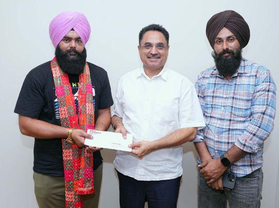 ਫ਼ੋਟੋ ਕੈਪਸ਼ਨ: ਸੀ ਜੀ ਸੀ ਯੂਨੀਵਰਸਿਟੀ ਮੋਹਾਲੀ ਦੇ ਸੰਸਥਾਪਕ ਚਾਂਸਲਰ ਰਸ਼ਪਾਲ ਸਿੰਘ ਧਾਲੀਵਾਲ ਪਾਵਰ ਸਲੈਪ ਚੈਂਪੀਅਨ ਜੁਝਾਰ ‘ਟਾਈਗਰ’ ਸਿੰਘ ਨੂੰ ਸਨਮਾਨਿਤ ਕਰਦੇ ਹੋਏ।