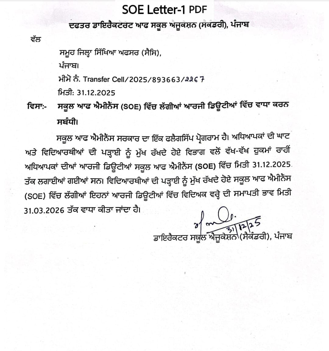 ਸਕੂਲ ਆਫ਼ ਐਮੀਨੈਸ ਦੇ ਅਧਿਆਪਕਾਂ ਦੀ ਡੈਪੂਟੇਸ਼ਨ ਕੀਤੀ ਐਕਸਟੈਂਡ