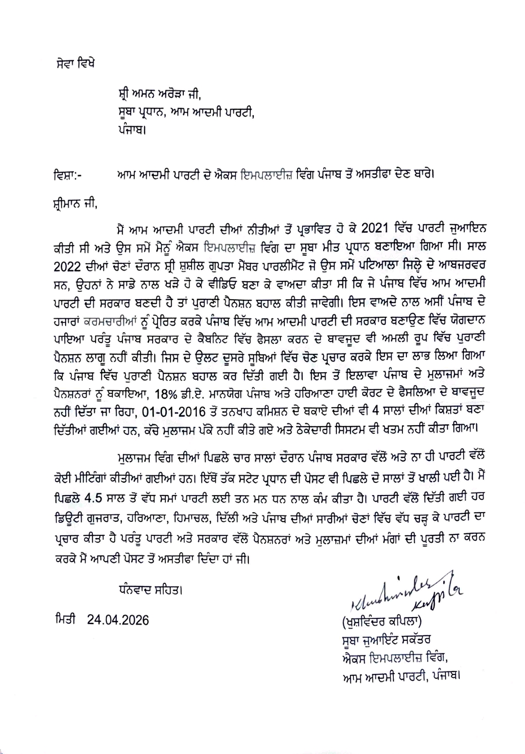 ਚੰਡੀਗੜ੍ਹ, 24 ਅਪ੍ਰੈਲ 2026 : ਆਮ ਆਦਮੀ ਪਾਰਟੀ ਪੰਜਾਬ ਦੇ ਐਕਸ ਇਮਪਲਾਇਜ਼ ਵਿੰਗ ਦੇ ਸੂਬਾ ਜੁਆਇੰਟ ਸਕੱਤਰ ਖੁਸ਼ਵਿੰਦਰ ਕਪਿਲਾ ਅਸਤੀਫ਼ਾ ਦੇ ਦਿੱਤਾ ਹੈ।