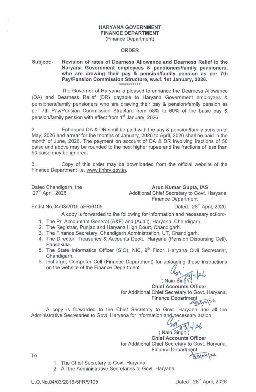 ਚੰਡੀਗੜ੍ਹ, 28 ਅਪ੍ਰੈਲ 2026 : ਹਰਿਆਣਾ ਸਰਕਾਰ ਨੇ ਮੁਲਾਜ਼ਮਾਂ ਦੇ ਮਹਿੰਗਾਈ ਭੱਤੇ (DA) ਵਿੱਚ 2 ਫ਼ੀ ਸਦੀ ਦਾ ਵਾਧਾ ਕੀਤਾ ਹੈ। ਹੁਣ, DA 58% ਤੋਂ ਵਧ ਕੇ 60% ਹੋ ਗਿਆ ਹੈ। ਜਨਵਰੀ 2026 ਤੋਂ ਲਾਗੂ ਵਾਧੇ ਦੇ ਬਕਾਏ ਜੂਨ ਵਿੱਚ, ਅਪ੍ਰੈਲ 2026 ਤੱਕ ਜਾਰੀ ਕੀਤੇ ਜਾਣਗੇ। ਇਹ ਫੈਸਲਾ ਕੇਂਦਰ ਸਰਕਾਰ ਦੇ ਫੈਸਲੇ 'ਤੇ ਅਧਾਰਤ ਹੈ, ਜਿਸ ਨਾਲ ਲੱਖਾਂ ਕਰਮਚਾਰੀਆਂ ਅਤੇ ਪੈਨਸ਼ਨਰਾਂ ਨੂੰ ਲਾਭ ਹੋਵੇਗਾ।